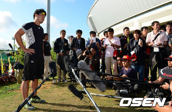 7일 오후 일본 오키나와 기노자 구장에서 오승환이 취재진들과 인터뷰를 하고 있다.