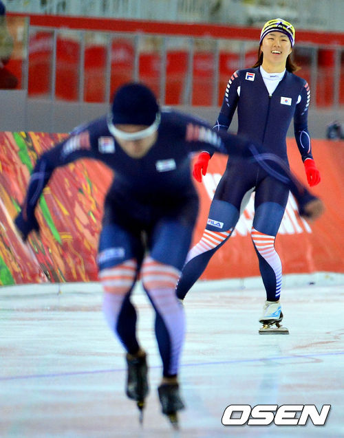 2014소치 동계올림픽 개막일인 7일(한국시간) 대한민국 스피트스케이팅 이상화가 이규혁과 러시아 소치 아들레르 아레나 경기장에서 훈련을 하며 미소짓고 있다.
