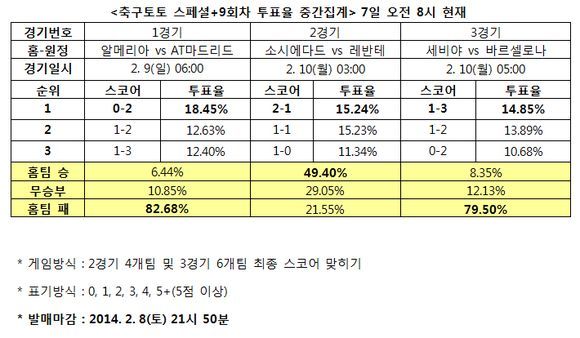 국민체육진흥공단(www.kspo.or.kr)이 발행하는 체육진흥투표권 수탁사업자인 스포츠토토 공식 온라인 발매 사이트인 베트맨(www.betman.co.kr)은 오는 9일부터 열리는 알메리아-AT마드리드(1경기), 소시에다드-레반테(2경기), 세비야-바르셀로나(3경기)전 등 스페인 프리메라리가 3경기를 대상으로 한 축구토토 스페셜+ 9회차 투표율 중간집계 결과, 축구팬의 대다수인 82.68%는 알메리아-AT마드리드(1경기)전에서 리그 선두 AT마드리드의 완승을 예상했다.
