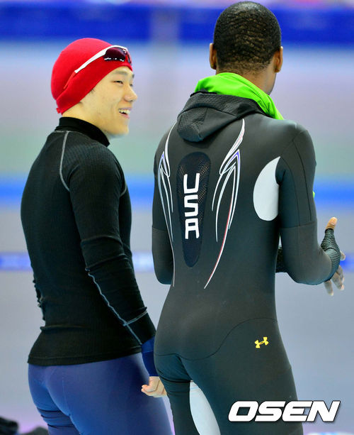 모태범이 미국 선수와 이야기를 나누고 있다.