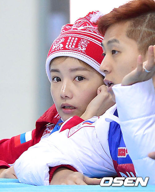 러시아 대표팀 안현수와 여자친구 우나리씨가 한국 쇼트트랙대표팀의 훈련을 바라보고 있다.