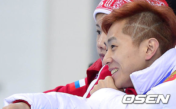 러시아 대표팀 안현수와 여자친구 우나리씨가 한국 쇼트트랙대표팀의 훈련을 바라보고 있다.