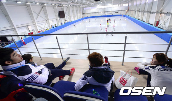 2014소치 동계올림픽 개막일인 7일(한국시간) 대한민국 쇼트트랙 대표팀이 러시아 소치 스케이팅 트레이닝 센터에서 훈련을 마치고 러시아 대표팀 훈련을 바라보고 있다.