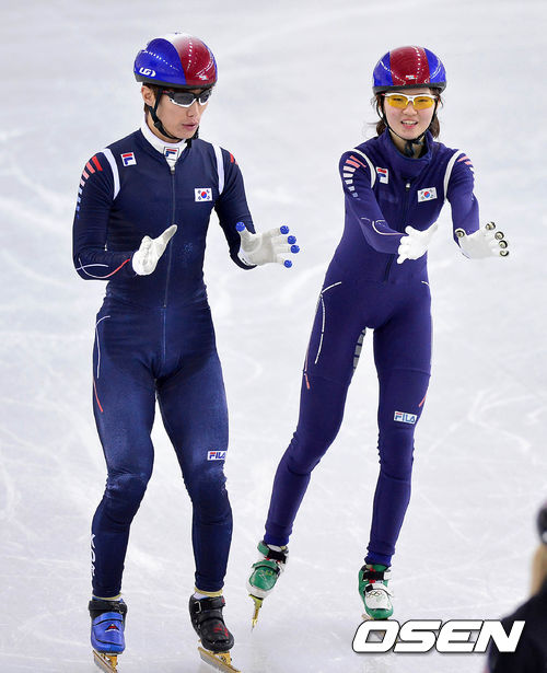 한국 쇼트트랙대표팀 이한빈과 심석희가 훈련을 하며 이야기를 나누고 있다.