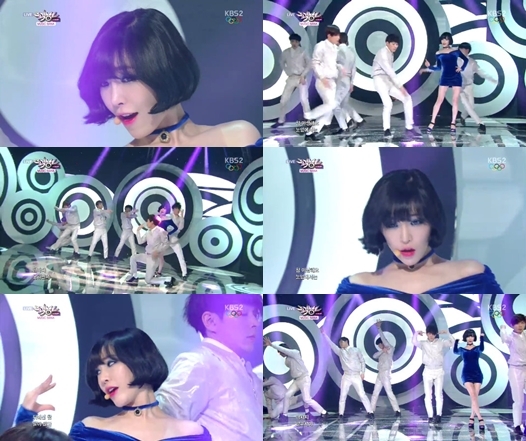 이날 방송에서 가인은 파란 미니드레스를 입고 등장해 완벽한 몸매를 과시해 남심을 흔들었다. 또 화려한 퍼포먼스에도 흔들림 없는 완벽한 라이브를 선보여 눈길을 끌었다.