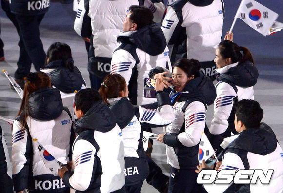 대한민국 선수단이 입장하며 기념촬영을 하고 있다.
