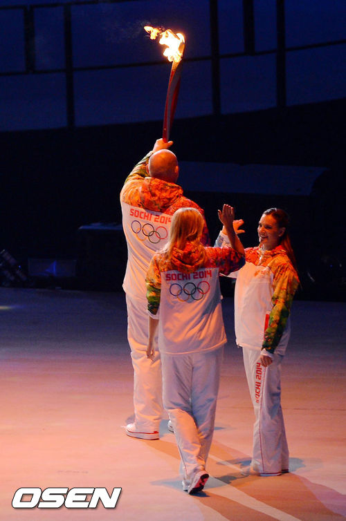 첫번째 성화주자인 마리아 샤라포바(테니스 선수)가 엘레나 이신바예바(장대높이뛰기)에게 성화를 넘겨준후 이신바예바가 알렉산더 카렐린(전 레슬링 선수)에게 전달하고 있다.