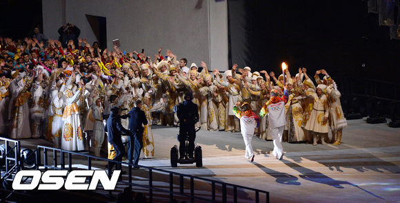 마지막 성화주자인 이리나 로드니나 (전 피겨 선수), 블라디슬라프 트레티악 (전 아이스하키 선수)가 박수를 받으며 성화대로 향하고 있다.