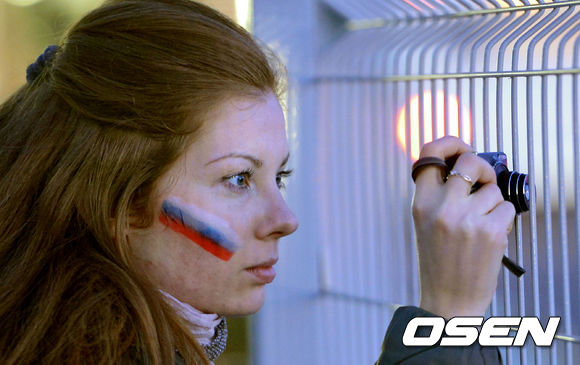 2014소치 동계올림픽 개막식이 열린 8일(한국시간) 러시아 소치 시내에서 한 러시아 팬이 러시아 페인팅을 그린채 사진을 담고 있다.