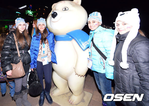 2014소치 동계올림픽 개막식이 열린 8일(한국시간) 러시아 소치 시내에서 한 러시아 팬이 마스코트 폴라베어 동상에서 포즈를 취하고 있다.