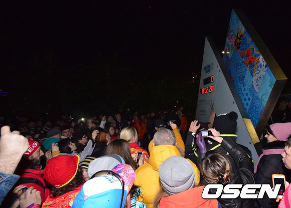 2014소치 동계올림픽 개막식이 열린 8일(한국시간) 러시아 소치 시내에서 러시아 자국민들이 타임키퍼 앞에서 카운트를 세며 환호하고 있다.