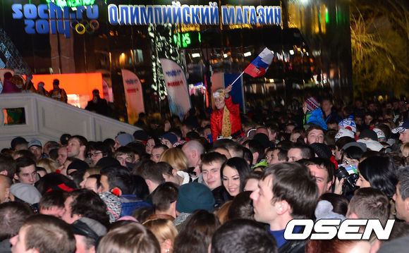 2014소치 동계올림픽 개막식이 열린 8일(한국시간) 러시아 소치 시내에서 수많은 러시아 자국민들이 대형모니터로 개막식 상황을 실시간으로 바라보고 있다.