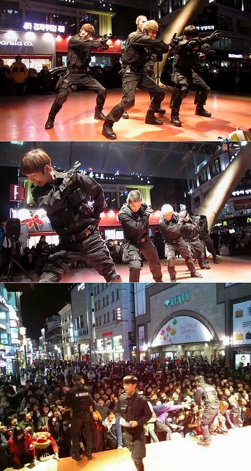 걸그룹 크레용팝 소속사 신인 보이그룹 가물치는 지난 6일 오후 대구 동성로에서 게릴라 공연으로 주변 일대를 마비시켰다.