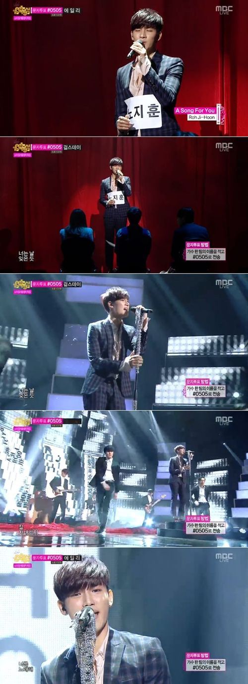 노지훈은 8일 오후 방송된 소치 동계올림픽 특집으로 꾸며진 MBC '쇼! 음악중심'에서 오디션 참가자로 시작해 결국 모두가 주목하는 가수로 성장하는 모습을 담은 무대연출로 '너를 노래해' 컴백무대를 선보였다.