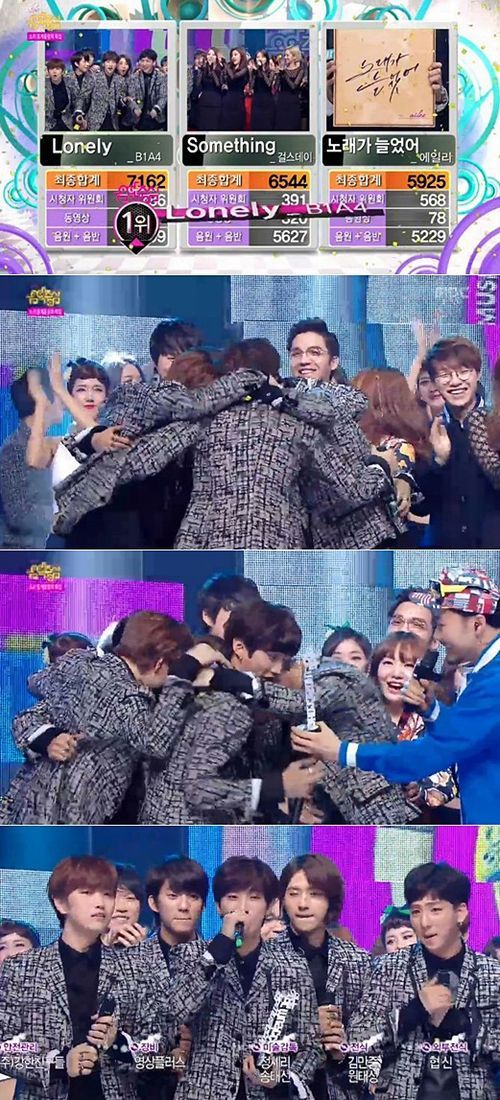 B1A4는 8일 오후 방송된 소치 동계올림픽 특집으로 꾸며진 MBC '쇼! 음악중심'에서 '론리'로 1위 후보였던 걸스데이 '섬씽'과 에일리 '노래가 늘었어'를 모두 제치고 1위를 차지했다.