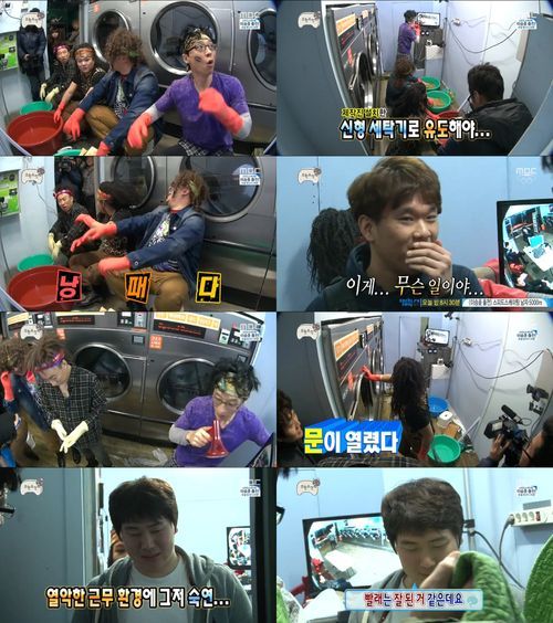 '무한도전' 멤버들이 인간세탁기로 변신, 쏟아지는 빨랫감에 당황했다.
