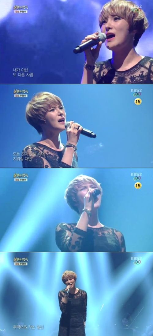 거미는 8일 방송된 KBS 2TV 예능 프로그램 '불후의 명곡, 전설을 노래하다'에 출연해 주현미의 곡 '추억으로 가는 당신'을 열창했다. 그는 명곡판정단으로부터 총 445표를 얻었다.