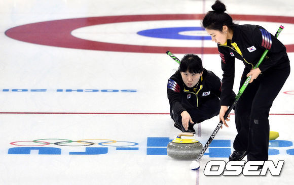한국여자컬링대표팀이 8일(현지시간) 러시아 소치 아이스큐브 컬링 센터에서 훈련을 하고 있다.
