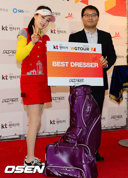 9일 오후 경기도 시흥시 화인비전스크린에서 열린 kt금호렌터카 2013-2014 WGTOUR 윈터시즌 4차 대회에서 베스트드레서 상을 받은 서재희가 골프존 임동진 마케팅 본부장과 포토타임을 갖고 있다.