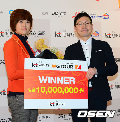 9일 오후 경기도 시흥시 화인비전스크린에서 열린 kt금호렌터카 2013-2014 WGTOUR 윈터시즌 4차 대회에서 우승한 한지훈이 김정관 IMC본부장과 포토타임을 갖고 있다.