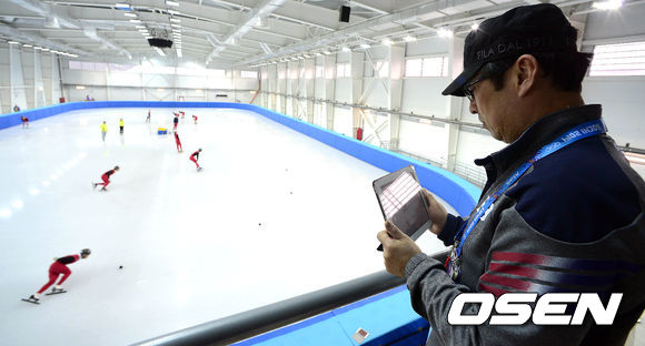 대표팀 윤재명 감독이 중국팀 훈련을 지켜보고 있다.