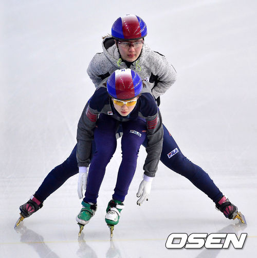 박승희가 심석희의 엉덩이를 힘껏 밀어주고 있다.