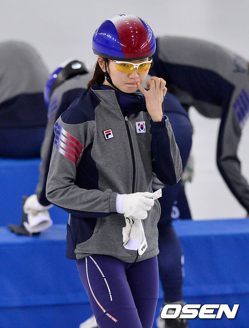 대표팀 심석희가 훈련에 앞서 입술 보호제를 바르고 있다.
