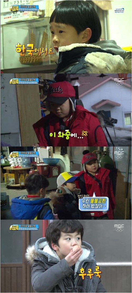 9일 방송된 MBC 예능프로그램 ‘일밤-아빠 어디가’는 윤후, 성빈, 김민율, 안리환, 임찬형이 저녁 재료를 얻기 위해 물물교환을 하는 모습이 담겼다.