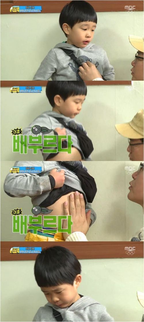6살 김민율이 저녁 식사를 마음껏 먹은 후 빵빵한 올챙이배를 자랑했다.