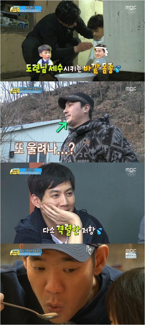 ‘상남자’ 안정환은 아들을 추운 날씨 속에 씻기느라 애를 먹었다. 아들은 따뜻한 방에서 씻게 하면서도 자신은 덜덜 떨면서 추운 밖에서 씻었다. 투덜거리고 투박한 표현이었지만 아들을 씻기면서 묻어나는 애정은 시청자들을 흐뭇하게 했다. 다음 날 밖에서 음식을 하면서도 서툰 기색이 엿보였지만 그래도 아들과 먹을 밥을 생각하며 분투했다.