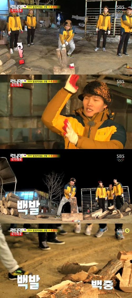 김종국은 9일 오후 방송된 SBS 예능프로그램 '일요일이 좋다-런닝맨'(이하 '런닝맨')에서 팀워크 훈련에서 실패한 후 같은 팀이었던 올스타팀 멤버들과 함께 장작 패기에 나섰다.