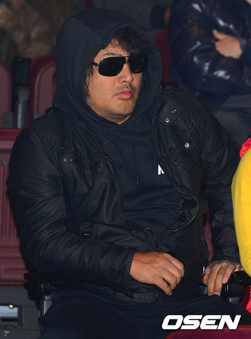 김보성이 객석에 앉아 경기를 기다리고 있다.