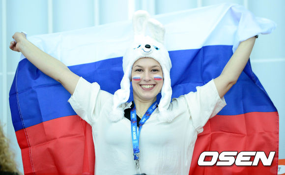 러시아 한 여성이 마스코트 모자에 국기를 들며 열띤 응원을 하고 있다.