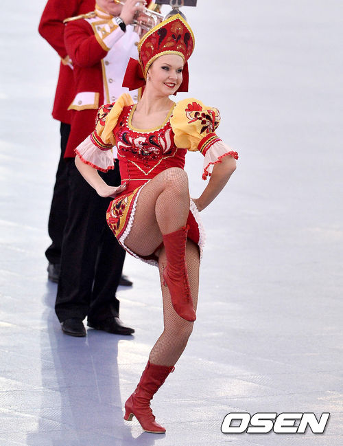 정빙시간에 러시아 응원단이 전통 무용을 선보이고 있다.