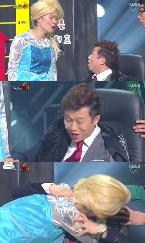 특히 박지선이 '렛잇고' 주인공으로 분해 돌고래 소리를 내다가 박성광에 "오빠 오랜만이다. 우리 결혼해서 슈퍼 개그맨 하나 낳아보자"고 키스해 폭풍 웃음을 선사했다.