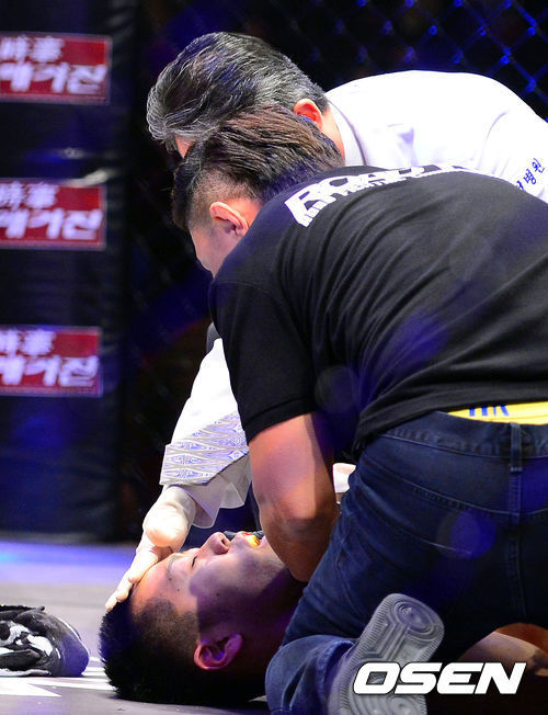 윤형빈은 경기 초반 다소 주춤했다. 전날인 8일 계체량에서 하루 만에 무려 6kg을 감량, 컨디션 문제가 거론되기도 했기에 불안한 면이 없지 않았다.