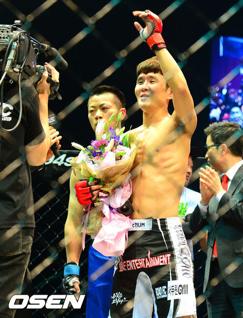 윤형빈은 9일 오후 8시 서울 송파구 방이동 올림픽공원 올림픽홀에서 치른 '로드 FC 14'에서 일본의 타카야 츠쿠다를 1라운드 4분 11초 만에 TKO로 때려눕혔다.