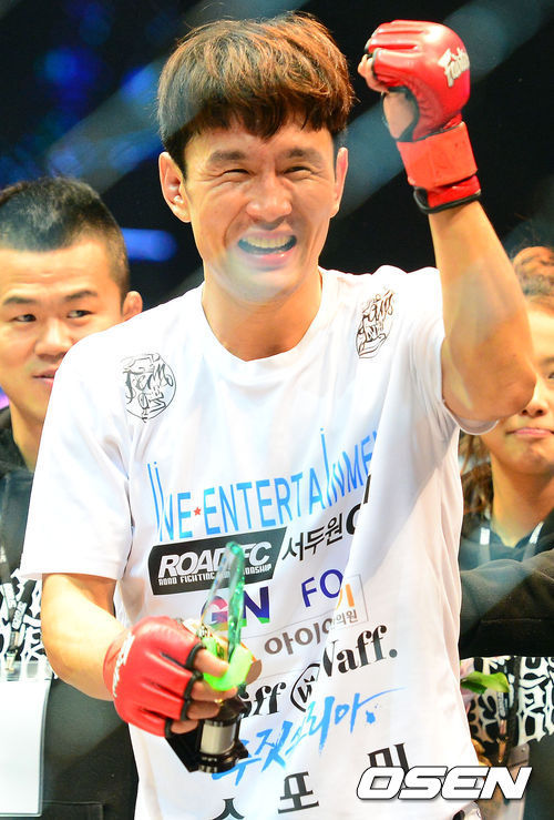 개그맨 윤형빈은 9일 오후 8시 서울 송파구 방이동 올림픽공원 올림픽홀에서 치른 '로드 FC 14'에서 일본의 타카야 츠쿠다를 1라운드 4분 11초 만에 TKO로 때려눕혔다.