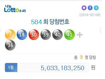 로또 584회 1등 당첨자는 당첨번호 6개를 모두 맞혀야하며 이번에는 3명의 당첨자가 나왔다. 이들은 각각 50억 3318만원 3250원씩을 받는다.