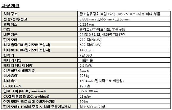 과감하면서도 미래지향적인 디자인과 더불어 최신 탄소섬유 강화 플라스틱 소재(CFRP)의 모노코크 구조를 통해 최첨단 경량디자인(795kg)과 우수한 공기역학(Cd 0.189)을 실현했다. 여기에 48마력 2기통 TDI 엔진과 27마력 전기모터, 듀얼 클러치 방식의 7단 DSG 변속기, 리튬 이온 배터리로 구성된 플러그인 하이브리드 시스템을 채택하고 있다. 이를 통해 배기가스 배출 없이 100% 전기모드로 50km까지 주행이 가능하며, 1리터의 연료 만으로 최대 111.1km를 주행할 수 있다.
