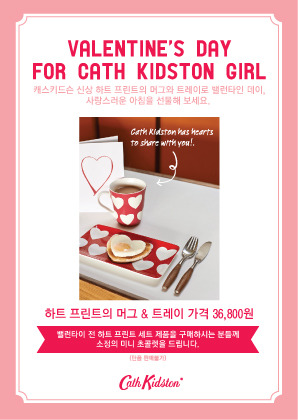 먼저 캐스 키드슨에서는 사랑하는 이에 대한 마음을 담은 하트 프린트 머그컵과 트레이 셋트를 구매하면 달달한 초콜릿을 증정해주는 이벤트를 진행한다. 오는 12일부터 14일까지 캐스 키드슨 서울 명동 나인트리점, 가로수길점에서만 진행되는 ‘Cath Kidston hearts You(캐스 키드슨 헐트 유)’ 이벤트는 재고 소진 시까지 진행된다.