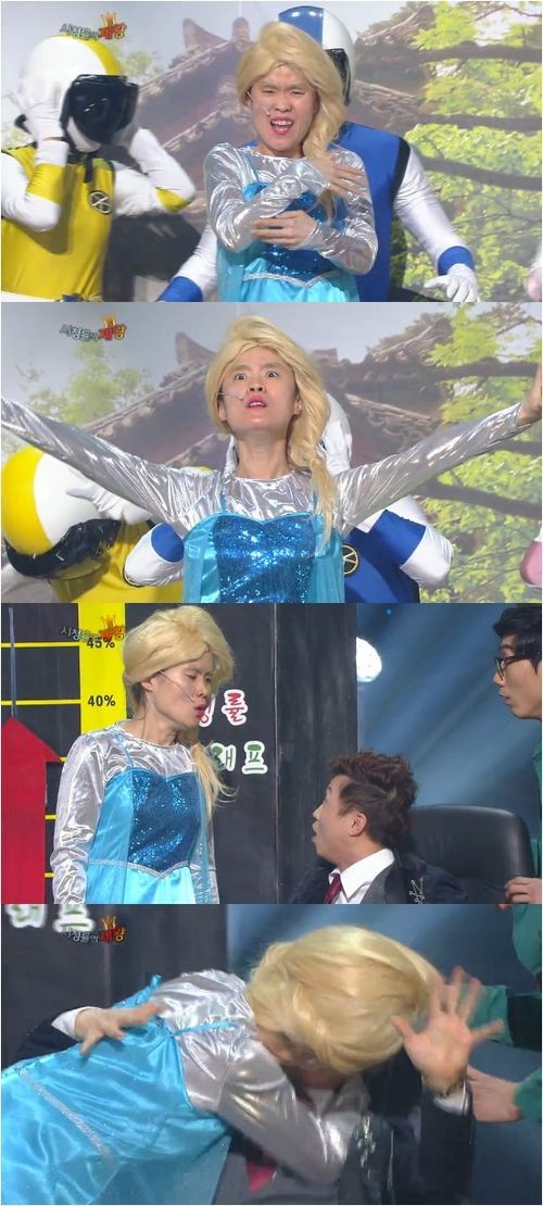 개그우먼 박지선이 애니메이션 ‘겨울왕국’ 캐릭터인 엘사로 변신해 박성광에게 기습 키스를 했다.