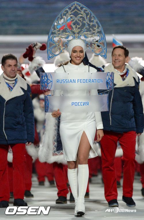 축구스타 크리스티아누 호날두의 여친 러시아 모델 이리나 샤크가 러시아 선수단 명패를 들고 입장하고 있다.