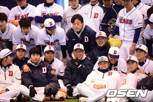 두산 선수들과 코칭스태프가 모두 모여 선수단 단체 사진 촬영을 진행했다. 주장 홍성흔과 대화를 나누며 환하게 미소짓는 송일수 감독(사진 가운데 맨 아래)./dreamer@osen.co.kr