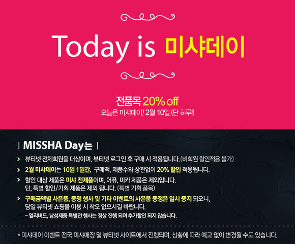 할인 대상 제품은 미샤 전제품이며 어퓨, 키마 제품은 제외된다. 또, 특별 할인이나 기획 제품 품목도 제외된다.
