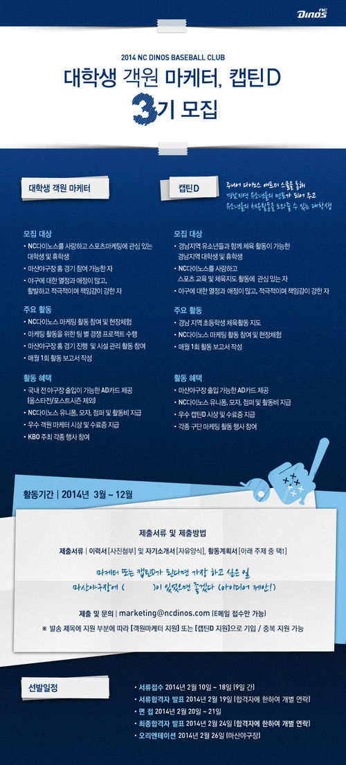 NC 다이노스가 10일부터 오는 18일까지 '대학생 객원 마케터' 및 '캡틴D(Captain D)' 3기를 모집한다.