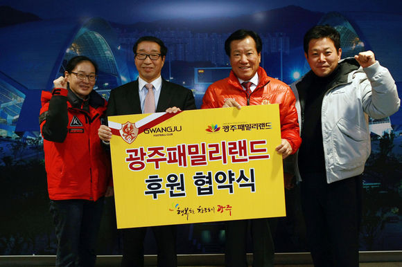 광주는 10일 광주 서구 풍암동 월드컵경기장 2층 사무국에서 광주FC 박해구 단장과 광주패밀리랜드 장봉조 사장 등 관계자 10여명이 참석한 가운데 후원협약식을 가졌다.