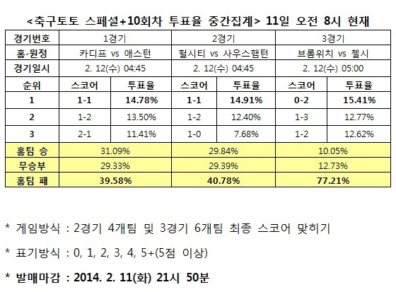 2경기 헐시티-사우스햄턴전의 경우 9위 사우스햄턴이 승리할 것이라는 축구팬이 40.78%를 차지했고, 헐시티 승리(29.84%)와 무승부(29.39%)순으로 나타났다. 최종 스코어의 경우 1-1 무승부가 14.91%로 최다를 기록했다.