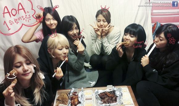 AOA는 10일 공식 페이스북을 통해 치킨 파티 사진을 게재했다. 사진 속 AOA는 치킨을 들고 환희 가득한 표정을 짓고 있다.