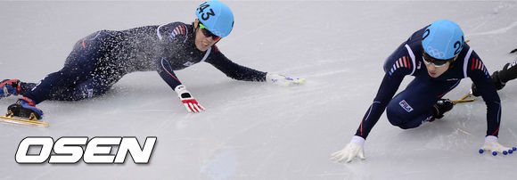 10일(한국시간) 러시아 소치 아이스버그 펠리스에서 열린 2014 소치올리픽 쇼트트랙 1500mm 남자 준결승, 2조 대한민국 신다운과 이한빈이 충돌하며 함께 넘어지고 있다. 이한빈은 어드벤스로 가까스로 결승에 진출하게 되었다.